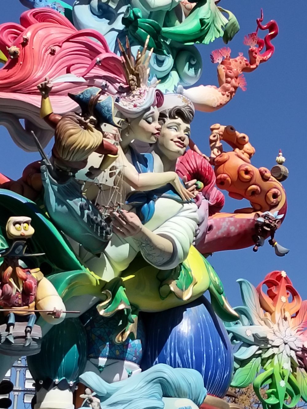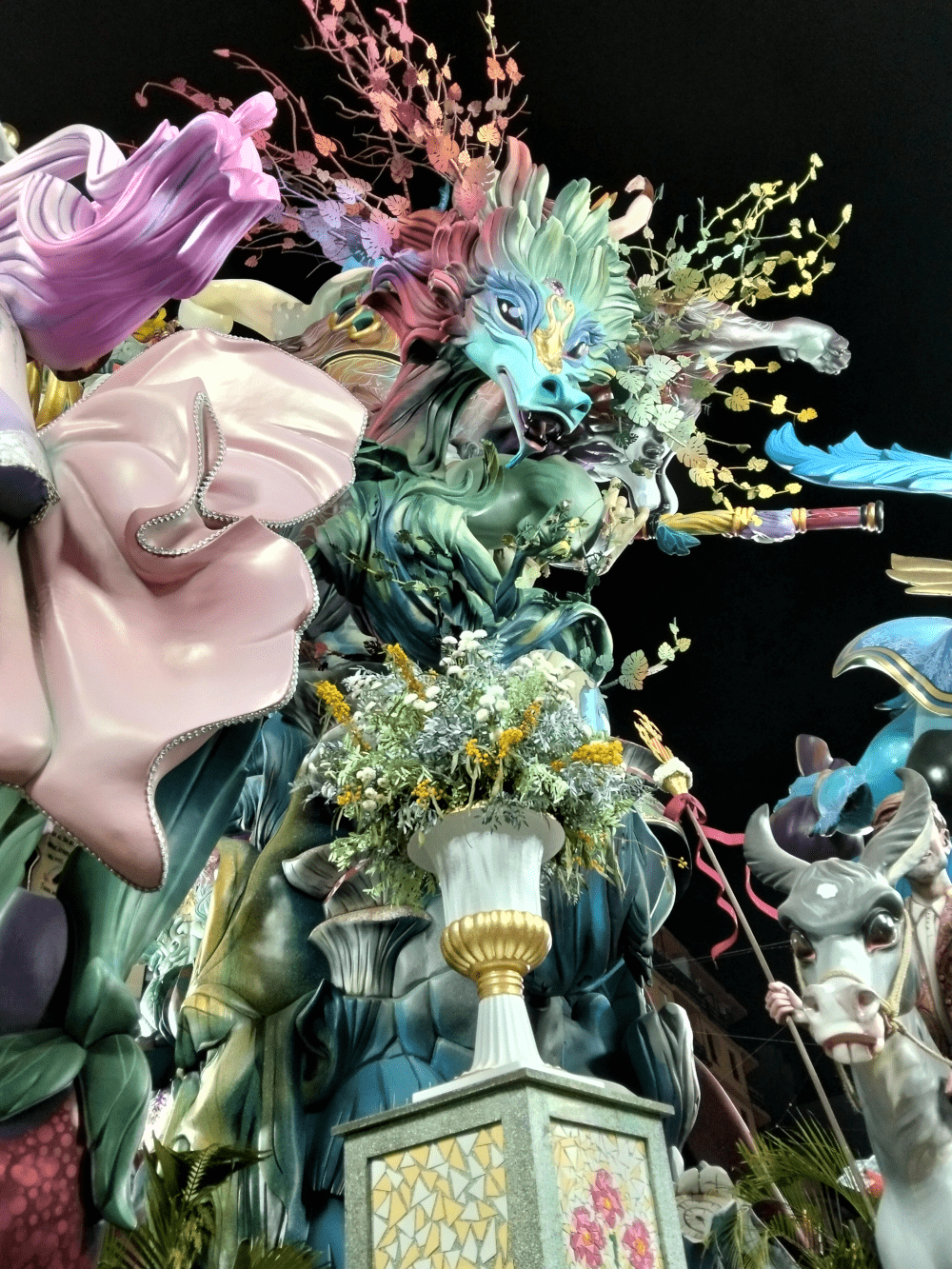 Así mismo, cuando alcanzamos la máxima categoría, Convento ha sido incontestablemente la número 1 de las mejores fallas de VLC pero eso no significa que nos guste como modela en ocasiones el taller de Llongo, su artisTa. El detallismo, barroquismo y pintura de Pacolo han demostrado que son artisTas consistentes como para llegar a cotas aparentemente inalcanzables. La falla conventual ha sido gigante, poderosa pero no ha existido una iconografía o rostro para enmarcar. El lenguaje asociativo en las fallas y los remates arbolados tienen estas cosas. Profusión innumerable de personajes que te gustarán unos más y otros menos pero no se te queda en el recuerdo un personaje “icono”. Tal vez en Convento, tendríamos que nombrar pero en su parte dorsal el centauro tanto por anatomía como por su rostro realmente exquisito. Pero este año quizá también se recuerde por los comentarios transversales y claros de Paco Torres contra la actual Junta central fallera – no va a volver a la Sección Especial –. Nadie que nosotros recordemos en los últimos diez años, ha hablado tan claro contra los jurados de la Sección Especial, en este caso elegidos por Nico Garcés, vicepresidente de la JCF. La alusión a su gestión ha sido concluyente. Los premios está amañados. Ah ¿qué no ha dicho eso…? Sí y yéndose muy dolido de la que es su casa como fallero de la Plaza del Pilar y más aún como profesional. El cuarto premio puede parecer injusto pero es cierto que la competencia que tenía en Antiga y Na Jordana tampoco era baladí. Aún así, siendo un buen año general en la Sección Especial, si tenemos que destacar a una falla que ha marcado una hisToria importante en las fallas, ha sido la falla municipal de Chaplin “Hope”. No solamente la subrayamos por su alTura sino por su excelente confección y ese gesto tan charlotiano que desprende al mirar la mariposa que se halla en su mano izquierda. Chaplin no solo se convirtió en una falla icono por sus 31 metros finales sino porque por primera vez junto al Moisés de Manolo García (2014) o el David de Martínez Mollá (1991) la falla se come a la plaza y no al revés. La presencia de la figura de Chaplin era presente y aposentada en la demarcación con gran personalidad.