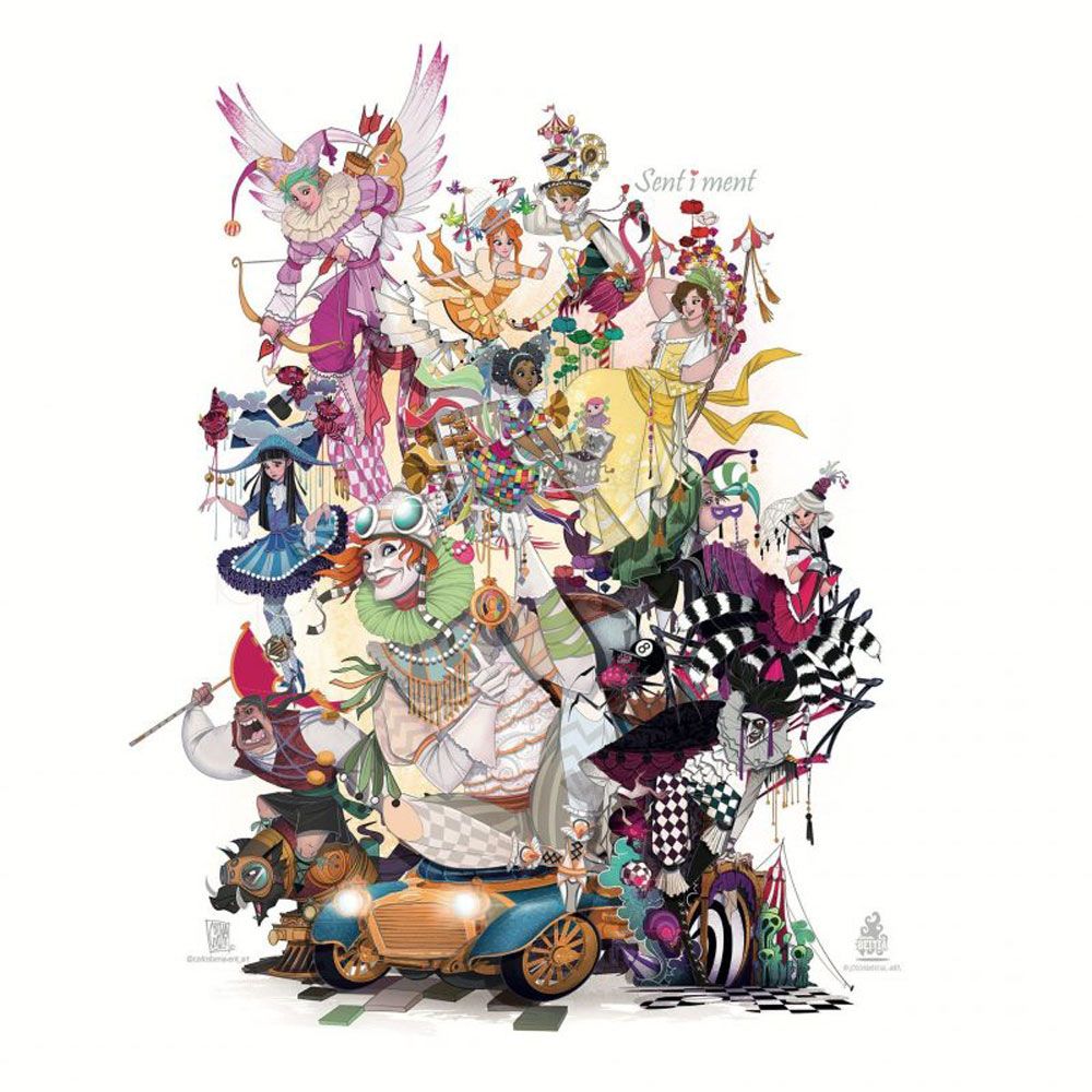 Composición: Sin embargo, y esto también lo dialogó «Pangea» con el espectador, la obra de 2025 recuerda mucho a la falla de este presente ejercicio. O viceversa. No son para nada iguales en las formas pero sí muy similares en colorido y en el fondo. Y aunque se conserva el arbolado de decenas de personajes en el remate, hay siempre alguno que destaca dimensionalmente unos centímetros más. Y si el año pasado fue el explorador junto al indígena – la unión de dos continentes – en los cuales se centraron las miradas centrales, este año es el payaso de los sortilegios que está montado al igual que el resto de la falla en un coche de estilo clásico… Es decir, los personajes principales e Beitia no centralizan la composición. La diagonalizan. Son como vértices en escena. Se encuentran en un lado de la acción para que el ojo se pierda en el resto del contenido de la composición en un pequeño gran caos informativo. La «L» curva del año pasado cede el testigo a una composición mas homogénea este año. Las diferentes damiselas decimonónicas del remate top superior derecha cierran espacios y de paso encuadra mejor la calle Rascanya con el fondo del teatro beitiano en cuanto a su cruce de calles.