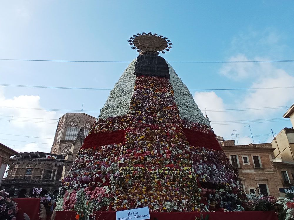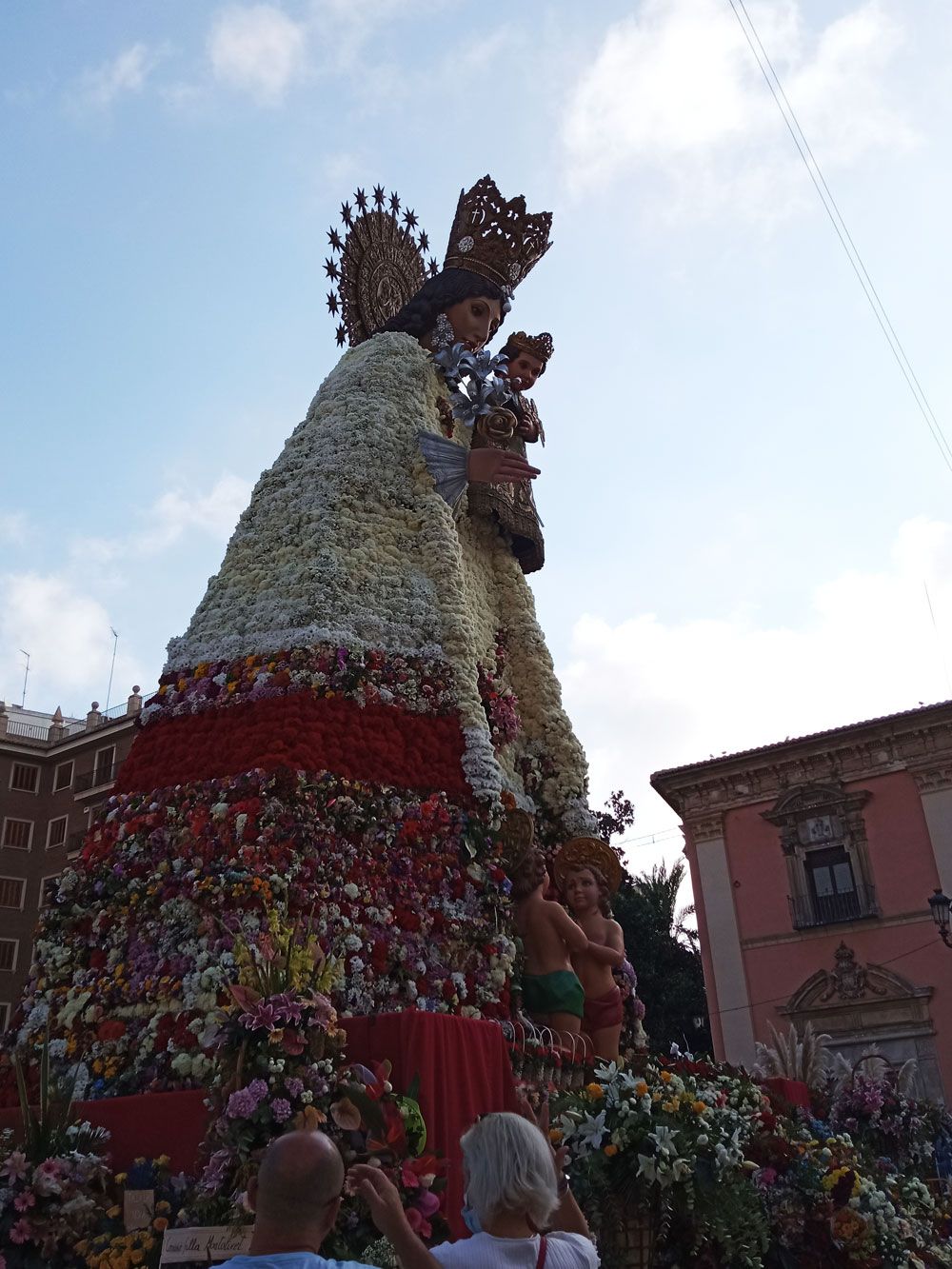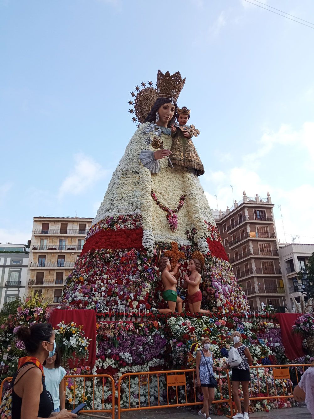 La Ofrenda de este año en Fallas ha sido especial y escasa en volumen floral por las restricciones imperantes de la covid-19, cambiar los ITinerarios por las obras existentes en la Plaza de la Reina y por estar por primera vez en su hisToria cerrada ante el público. Ante la disyuntiva de celebrarse las fallas o no y proceder a importaciones o compras correspondientes de miles y miles de claveles y con menos falleros participantes en el horizonte, los claveles eran escasos en cantidad para rellenar el manto de la Virgen como era debido. La concepción pues del manto que sigue un diseño marcado como cada año no ha podido llevarse a término por parte de los vestidores de la Virgen. El mayor espacio para la colocación de todo tipo de flores según el orden de llegada de las comisiones falleras ha predominado en una plaza que está desconocida por la escasa aportación de canastillas este año.
