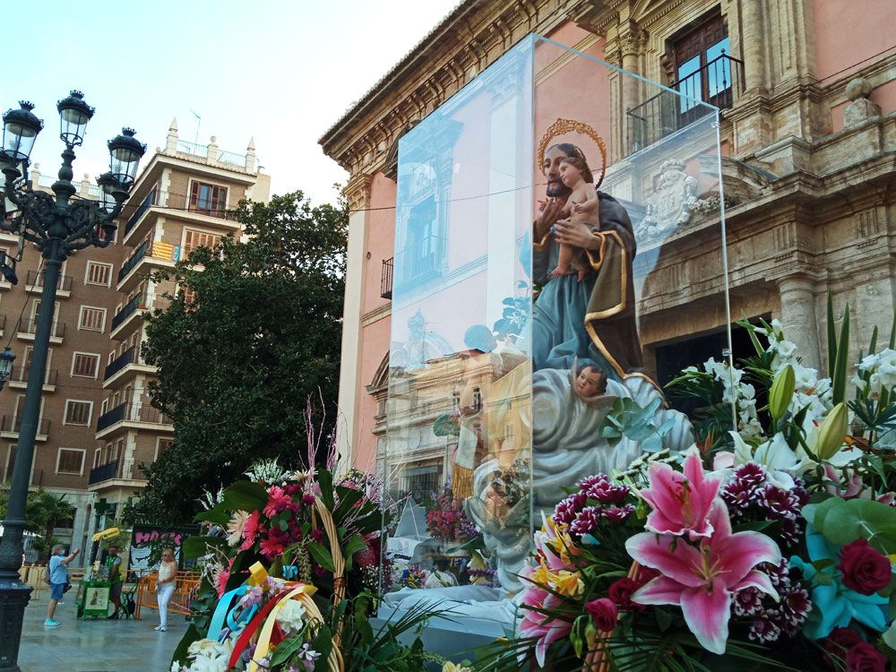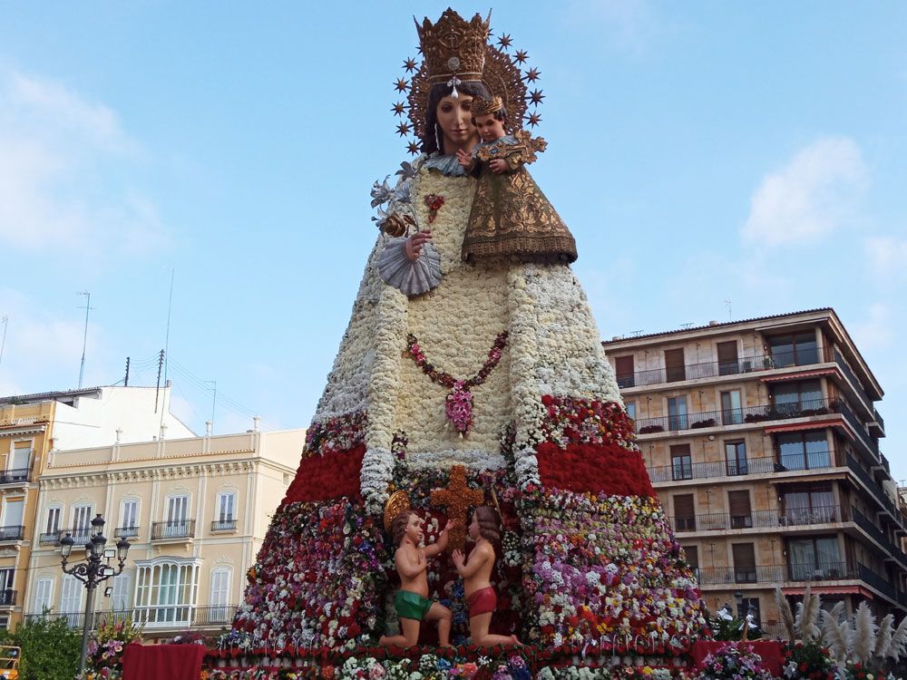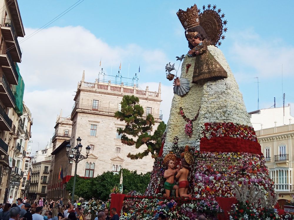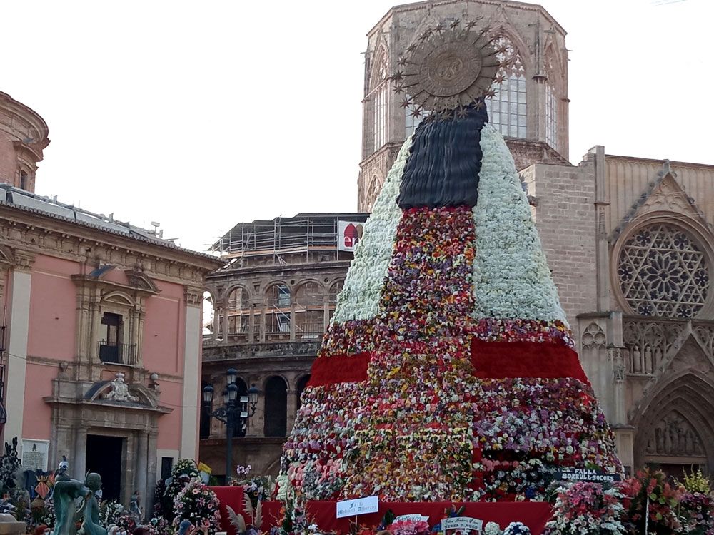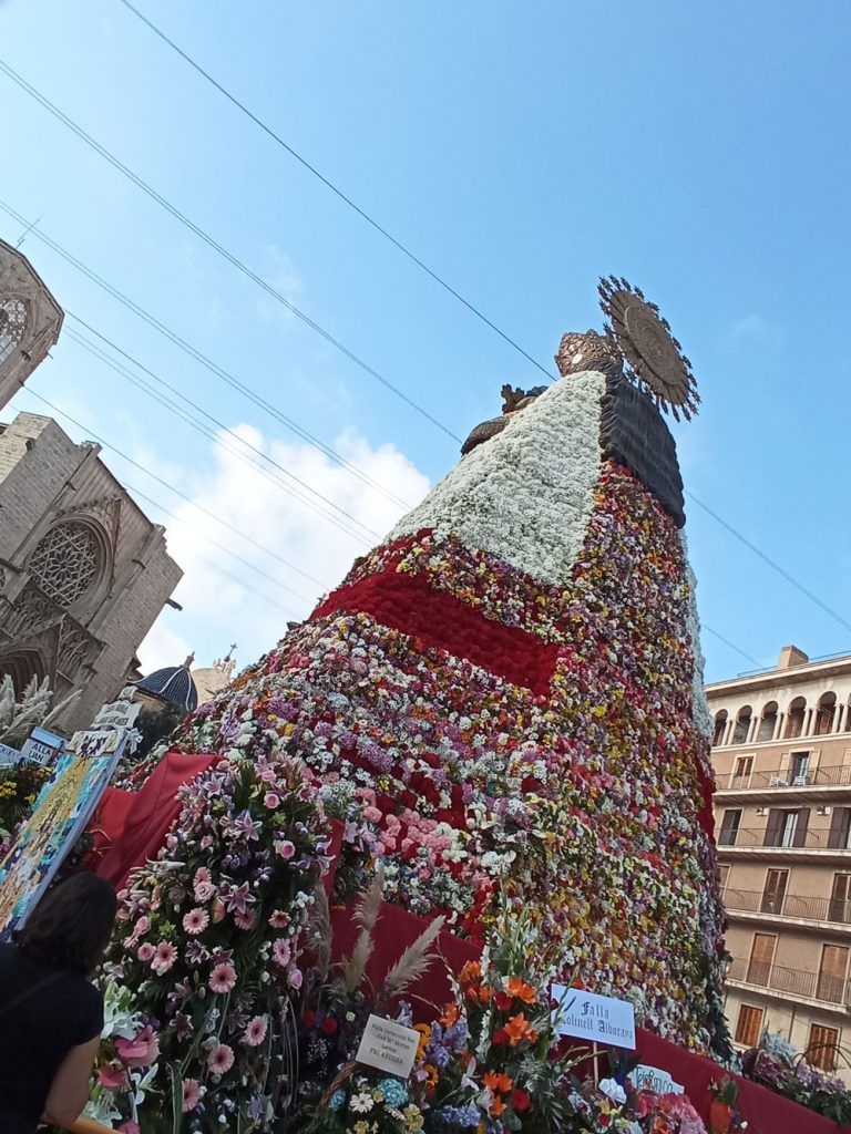 La Ofrenda de este año en Fallas ha sido especial y escasa en volumen floral por las restricciones imperantes de la covid-19, cambiar los ITinerarios por las obras existentes en la Plaza de la Reina y por estar por primera vez en su hisToria cerrada ante el público. Ante la disyuntiva de celebrarse las fallas o no y proceder a importaciones o compras correspondientes de miles y miles de claveles y con menos falleros participantes en el horizonte, los claveles eran escasos en cantidad para rellenar el manto de la Virgen como era debido. La concepción pues del manto que sigue un diseño marcado como cada año no ha podido llevarse a término por parte de los vestidores de la Virgen. El mayor espacio para la colocación de todo tipo de flores según el orden de llegada de las comisiones falleras ha predominado en una plaza que está desconocida por la escasa aportación de canastillas este año.