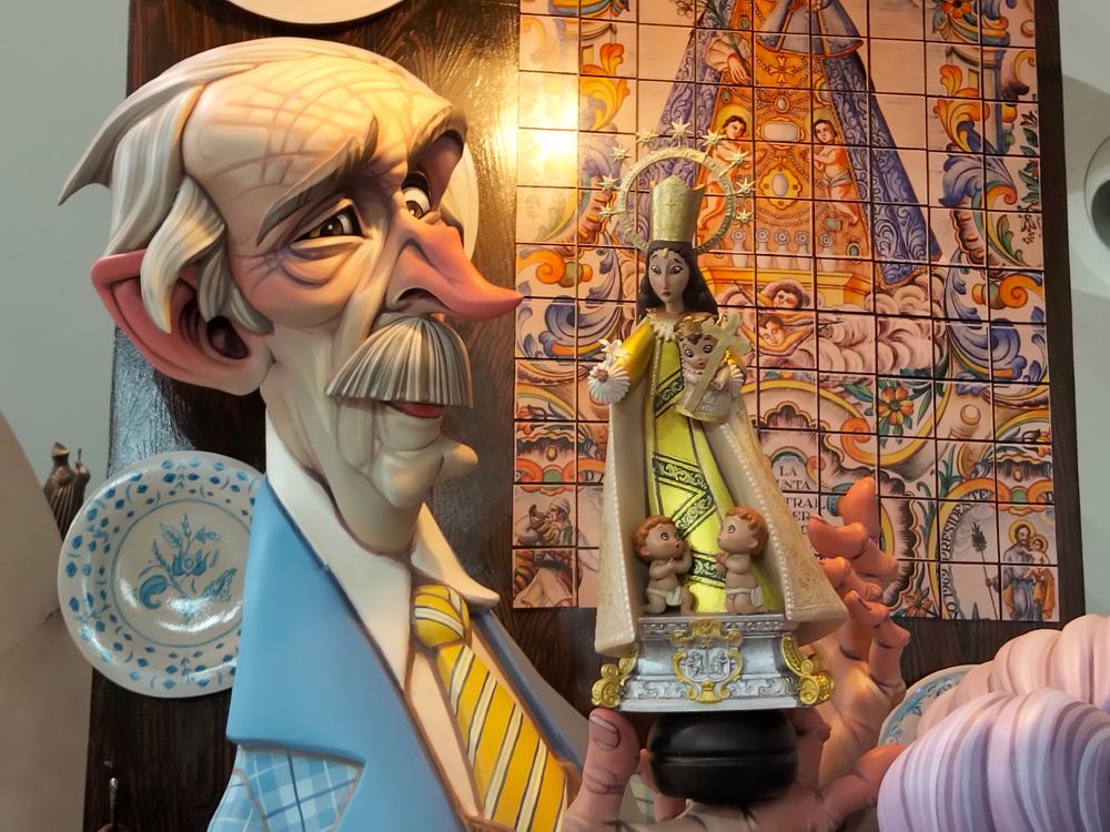 Como no podía ser de otra manera y más con las victorias que está cosechando ConvenTo e Jerusalén en los últimos tiempos en la Especial, ha habido varias alusiones hacia el responsable de la elección de los jurados, Nico Garcés de la JCF, que de forma muy irónica y humorística ha salido cual pitonisa, por ejemplo en San Franciso de Borja y a su vera un Juan Roig «influyente» que tiene a media familia en los altos vuelos de la sociedad fallera… Santi Ballester, presidente de la Junta Central Fallera – ex presi de ConvenTo – también ha salido en algunos grupos a especto.Por otra pate, la apología se ha centrado especialmente en tres personajes que han sido homenajeados en secciones intermedias como Juan Alberto Navarro, artisTa fallero muy querido de falles i fogueres -, Julián Carabantes – ex presidente de la Falla Beteró y ex mascoTa del VCF -, ambos DEP. Y en el caso de Miguel Santaeulalia padre, su figura se halla en la sección más aventajada de 1ª A. Con respecto al último ninot, no se puede descartar nada pero pueda ser una de las figuras favoritas para llevarse el indulto, al menos por el verismo realista que ha obtenido un Miguel Ángel Santaeulala más lladroniano que nunca, hijo mayor, que este año ha aportado colaboraciones de calidad tanto en el diseño como en el modelado y escultura en el presente ejercicio junto a otros compañeros y comisiones.