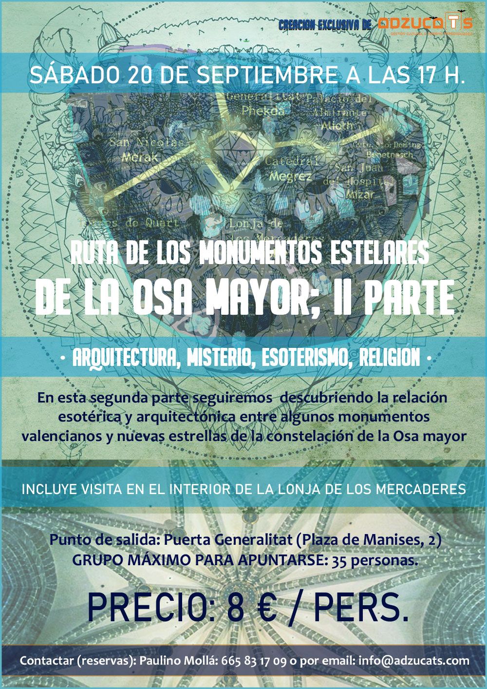 El próximo sábado 20 de septiembre, adzucaTs abrirá las puertas a la nueva temporada 2025/26 con la sección de ruTas abiertas para todos los públicos. En una sesión única que tendrá su inicio a las 17 h., en la Pl. Manises, 2 (Generalitat), la ruTa de los monumentos esTelares de la Osa Mayor, II parte, nos adentrará en el mundo esotérico, religioso y astronómico de VLC ciudad y además podremos visitar el interior de la Lonja de los mercaderes. Como ya explicamos en la I parte y en nuestra introducción del servicio en esta web, existe un alineamiento estelar de la constelación de la Osa Mayor con m0onumentos civiles y religiosos en el centro de VLC que merecen una explicación.